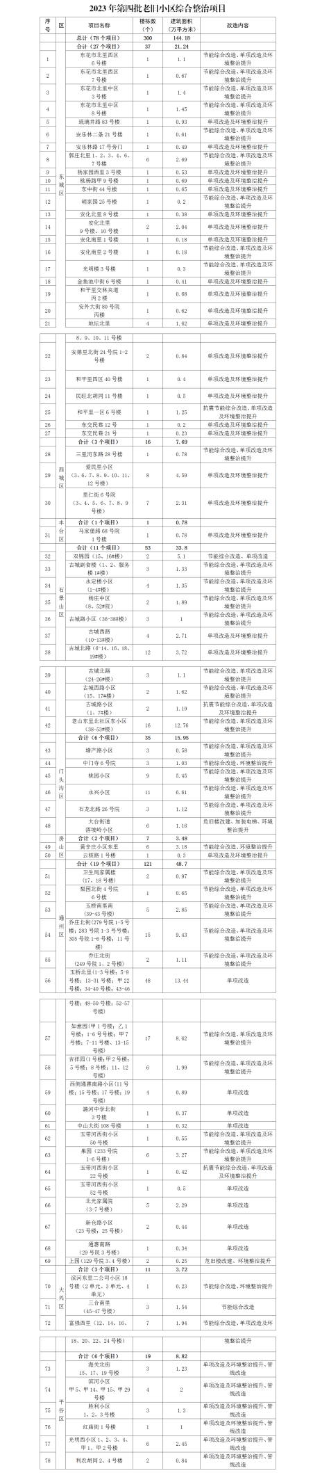 今年北京市第四批老舊小區(qū)綜合整治項目涉及東城、西城、豐臺、石景山、門頭溝、大興、房山、通州、平谷9個區(qū),各項目改造內容根據(jù)小區(qū)居民改造意愿確定,主要包括危舊樓改建、抗震節(jié)能綜合改造、節(jié)能綜合改造、單項改造及環(huán)境整治提升等方面。