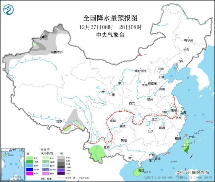 12月27日08時至28日08時,新疆北部、西藏東南部等地部分地區(qū)有小雪或雨夾雪,其中,新疆北疆北部和伊犁河谷等地部分地區(qū)有中到大雪,局地暴雪(10~12毫米)。云南西南部和中部、海南島、臺灣島等地部分地區(qū)有小雨,其中,臺灣島東部和南部等地部分地區(qū)有中雨。內(nèi)蒙古中東部、遼東半島等地部分地區(qū)有4~5級風(見圖1)。