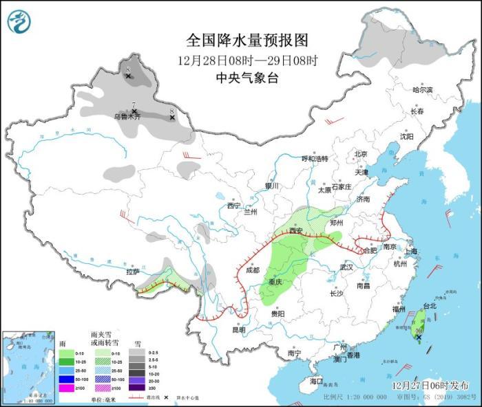 12月28日08時至29日08時,新疆北部、內(nèi)蒙古東北部、黑龍江西北部、西藏東南部、陜西中部等地部分地區(qū)有小雪或雨夾雪,其中,新疆沿天山地區(qū)和北疆北部等地部分地區(qū)有中到大雪(5~8毫米)。陜西南部、河南南部、西南地區(qū)東部、臺灣島等地部分地區(qū)有小到中雨,其中,臺灣島東部和南部等地部分地區(qū)有大雨(25~40毫米)。青海西部、甘肅河西、內(nèi)蒙古中部等地部分地區(qū)有5~6級風(見圖2)。