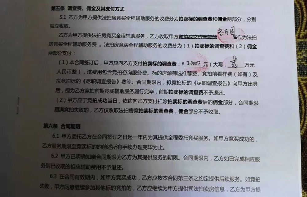 李先生說:“第一次說給錢的時(shí)候我沒同意,他又帶我去看同戶型,看了家屬說滿意,就上去叫我們交錢,承諾是包拍成功,但是合同寫的時(shí)候只寫了包過戶、包入住、包騰房,然后如果是拍成功過后,沒有成功入住,以房價(jià)的1.2倍回購,后面寫了個(gè)‘調(diào)查服務(wù)費(fèi)’,就先交錢,交錢之后再給我們簽合同,說你只要這次來簽了合同,第二次就來拍成功了,你交傭金1萬塊,第三次就是你過來拿房產(chǎn)證、鑰匙,其他不用你操任何心?!?/p>