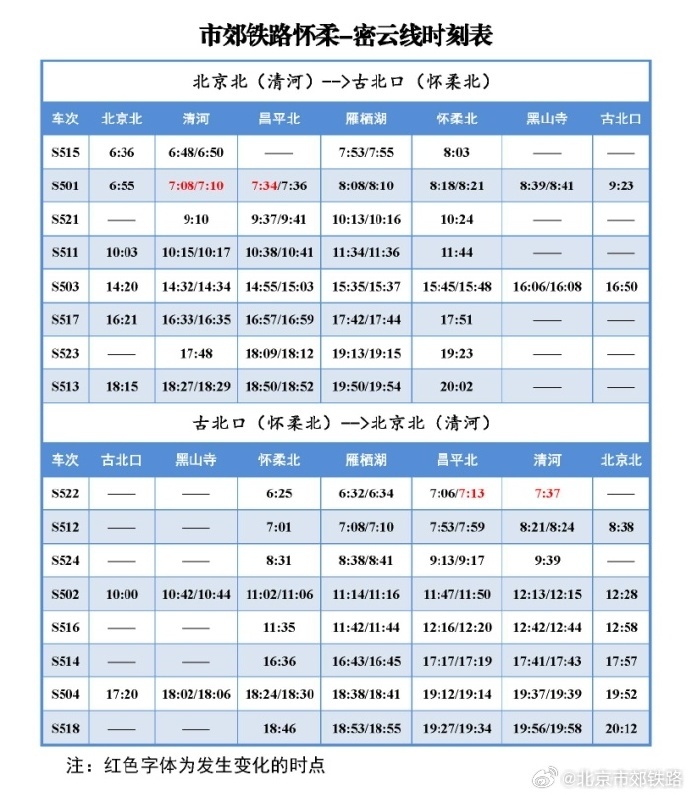 中新網(wǎng)1月9日電 據(jù)北京市郊鐵路官方微博消息,2024年1月10日起,北京市郊鐵路懷柔-密云線列車開行時(shí)點(diǎn)調(diào)整,具體列車時(shí)刻表如下圖所示: