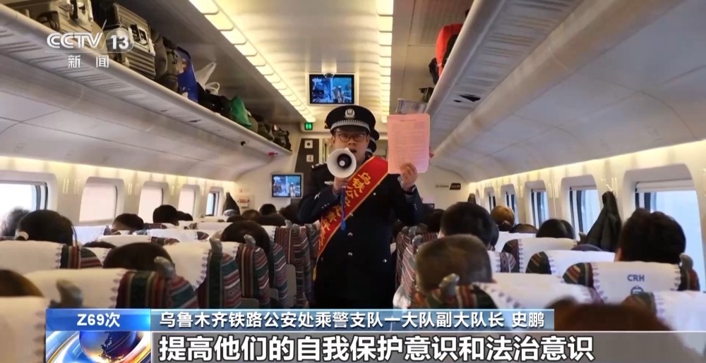 烏魯木齊鐵路公安處乘警支隊(duì)一大隊(duì)副大隊(duì)長 史鵬:希望通過這種方式,能夠讓乘坐我們列車的旅客提高他們的自我保護(hù)意識(shí)和法治意識(shí),確保旅客們平安出行。