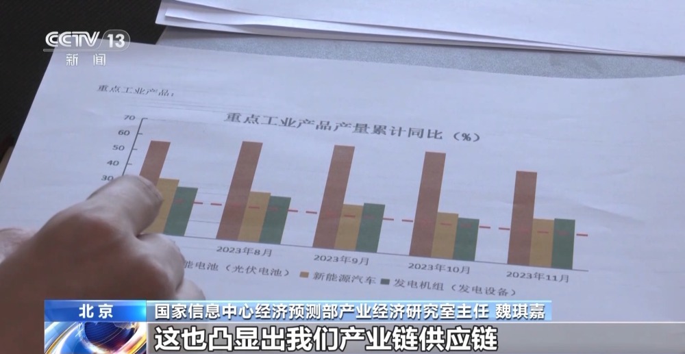 國家信息中心經(jīng)濟(jì)預(yù)測部產(chǎn)業(yè)經(jīng)濟(jì)研究室主任 魏琪嘉:像這樣的產(chǎn)品實(shí)現(xiàn)了兩位數(shù)的增長的這種態(tài)勢,其實(shí)對于一個(gè)經(jīng)濟(jì)體來講是實(shí)屬不易的。這也凸顯出我們產(chǎn)業(yè)鏈供應(yīng)鏈配套能力的大幅提升。產(chǎn)品背后蘊(yùn)含的是技術(shù)、要素的優(yōu)化組合,催生出新的生產(chǎn)能力,其實(shí)也是我們經(jīng)濟(jì)發(fā)展中的這種亮點(diǎn)。