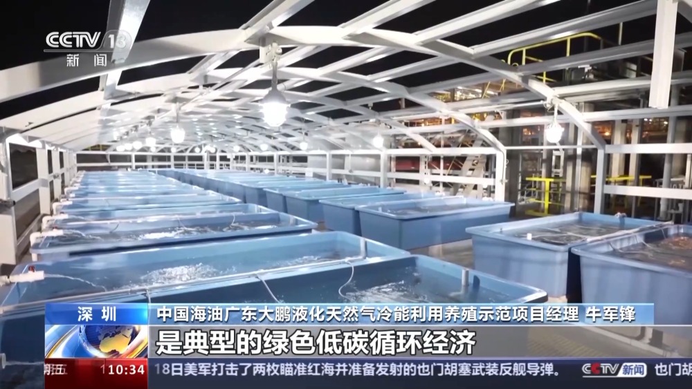 總臺央視記者 孫薊濰:我現(xiàn)在是在深圳的大鵬灣,身邊的這些藍(lán)色水箱里養(yǎng)殖著龍蝦、鮑魚等各種海鮮,養(yǎng)殖這些海產(chǎn)品的海水是廣東大鵬液化天然氣接收站的生產(chǎn)用水。
