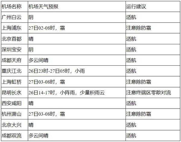 26日中午至27日中午,全國大部機(jī)場(chǎng)適航,27日凌晨至早間,哈爾濱、長春、沈陽、青島、南京、合肥、虹橋、浦東、杭州等機(jī)場(chǎng)有霜;另外,26日午后,云南中南部航路有分散對(duì)流。