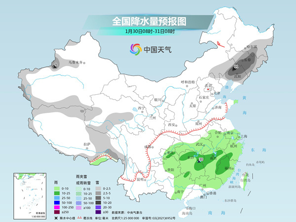 其中,1月31日,新疆伊犁河谷和南疆西部山區(qū)、西藏南部、陜西中北部、山西中南部、河北南部、河南北部、山東中南部等地部分地區(qū)有中到大雪或雨夾雪,陜西中部、山西南部、河南北部、山東西部等地局地有暴雪(10~16毫米)。江淮、江漢東部、江南北部等地部分地區(qū)有中到大雨,其中,安徽南部、湖北東部、湖南東北部等地局地有暴雨(50~70毫米)。