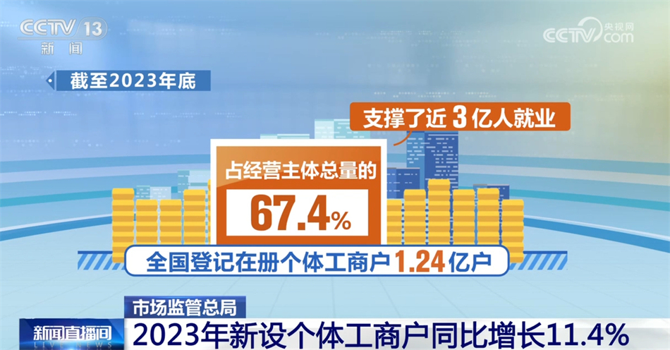截至2023年底,全國(guó)登記在冊(cè)個(gè)體工商戶1.24億戶,占經(jīng)營(yíng)主體總量的67.4%,支撐了近3億人就業(yè);全年新設(shè)個(gè)體工商戶2258.2萬(wàn)戶,同比增長(zhǎng)11.4%。