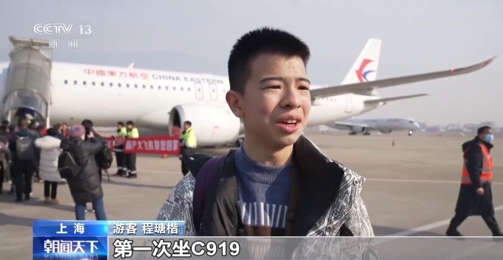 游客 程瑭楷:實在是太激動了,第一次坐C919,因為這是我們自己研發(fā)的飛機,它的流線型結(jié)構(gòu),還有起落架、引擎,真的太漂亮了。