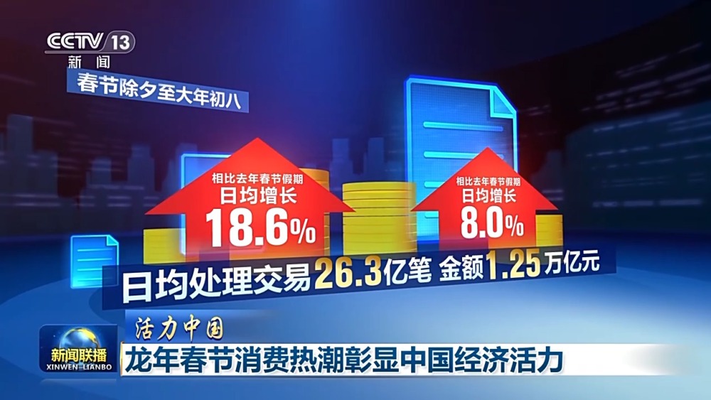 紅火的龍年春節(jié),折射出中國超大規(guī)模內需市場潛力,也進一步激發(fā)中國經(jīng)濟向好的動力。國家稅務總局增值稅發(fā)票數(shù)據(jù)顯示,今年春節(jié)假期,全國服務消費相關行業(yè)日均銷售收入同比增長52.3%,消費,正持續(xù)發(fā)揮拉動經(jīng)濟增長的主引擎作用。