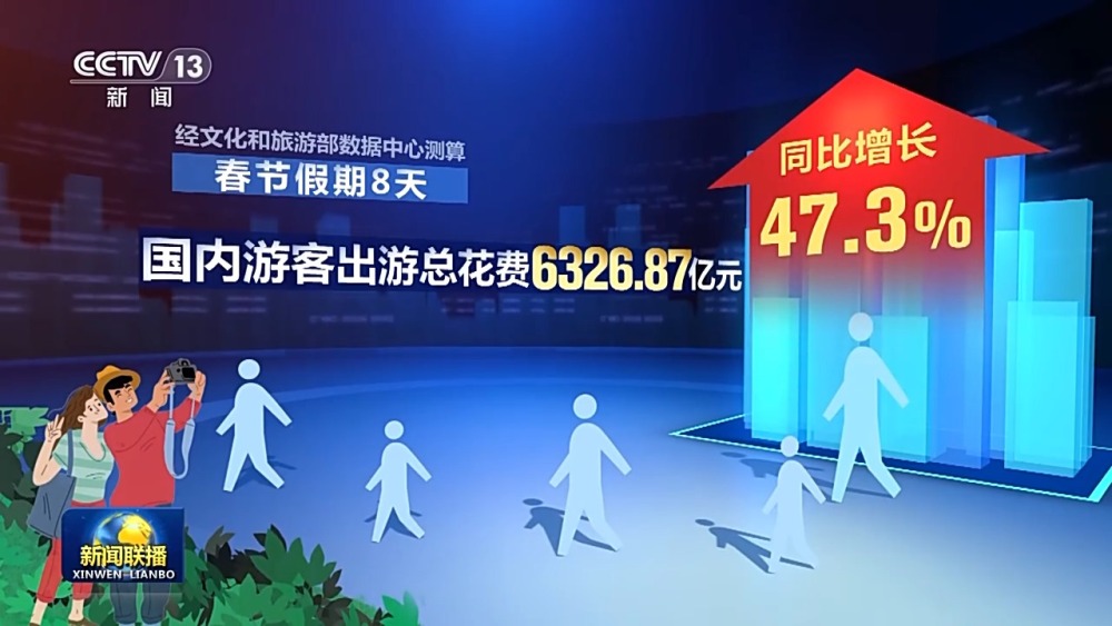 今年這個春節(jié),人們走得更遠,游玩時間更長。出行平臺分析訂單數(shù)據(jù)后發(fā)現(xiàn),假期里,超過一半的人選擇跨省出游,其中三成以上的人選擇兩個及以上目的地,中國游客出境目的地覆蓋全球1700多個城市,個性化出游、定制化消費成為新趨勢。在陜西景區(qū)里看一場沉浸式演出,游客既是觀眾,又是演員,全新消費體驗帶來上億元演出收入;四川把火鍋文化和特色觀光結合在一起,帶動特色餐飲消費熱度不斷。節(jié)日里,滕王閣景區(qū)北園向公眾開放,通過濱江水道,游客可以直接穿行老城區(qū)的商鋪。經(jīng)文化和旅游部數(shù)據(jù)中心測算,春節(jié)假期八天,全國國內旅游出游4.74億人次,同比增長34.3%,國內游客出游總花費6326.87億元,同比增長47.3%。