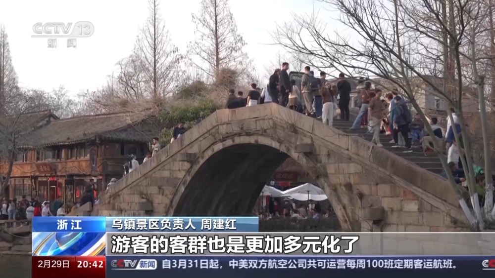 烏鎮(zhèn)景區(qū)負(fù)責(zé)人 周建紅:二月份來(lái)看,我們整個(gè)線上營(yíng)銷(xiāo)比例已經(jīng)超過(guò)了線下,占比達(dá)到了60%,旅游產(chǎn)品也是在做不斷的一個(gè)迭代,游客的客群也是更加多元化了。十年前的春節(jié),游客量在20多萬(wàn),那這一次的春節(jié)的話,我們已經(jīng)是突破了50萬(wàn)人次,也是翻倍的一個(gè)增長(zhǎng)。