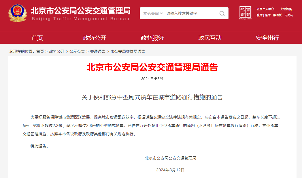 為更好服務(wù)保障城市貨運配送發(fā)展,提高城市貨運配送效率,根據(jù)道路交通安全法律法規(guī)有關(guān)規(guī)定,決定自本通告發(fā)布之日起,整車長度不超過6米、寬度不超過2.2米、高度不超過2.8米的中型廂式貨車,允許在五環(huán)外禁止中型貨車通行的道路(不含禁止所有貨車通行道路)行駛。其他貨車交通管理措施,按照本市各級政府及政府其他部門有關(guān)規(guī)定執(zhí)行。