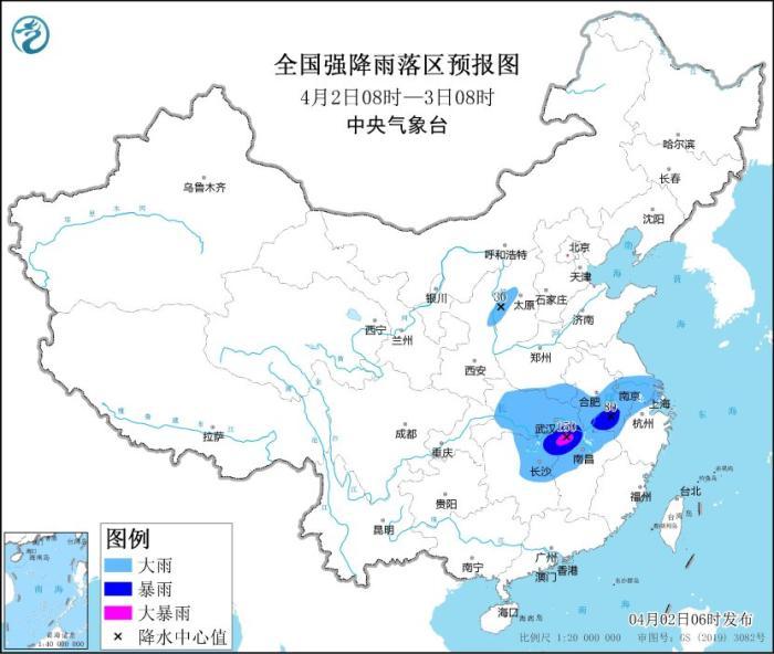 預計,4月2日08時至3日08時,湖北大部、河南南部、安徽南部、江蘇南部、上海北部、湖南東北部、江西北部、浙江西北部等地部分地區(qū)有大到暴雨,其中,湖北東南部、湖南東北部、安徽東南部、江西東北部等地局地有大暴雨(100~150毫米);湖北南部、湖南中北部、江西中北部、浙江中東部、廣西東北部等地的部分地區(qū)將有8-10級雷暴大風或冰雹天氣,局地風力可達11級以上,冰雹直徑可達2厘米;安徽中南部、江蘇南部、上海北部、湖北東部和南部、湖南中北部、江西中北部、浙江西部和北部、福建西北部、重慶中東部、貴州東部、廣西東北部等地的部分地區(qū)將有短時強降水天氣,最大小時雨量30-50毫米,局地可達70毫米以上。預計,強對流的主要影響時段為今天午后至夜間。中央氣象臺4月2日06時繼續(xù)發(fā)布暴雨藍色預警和強對流天氣黃色預警。