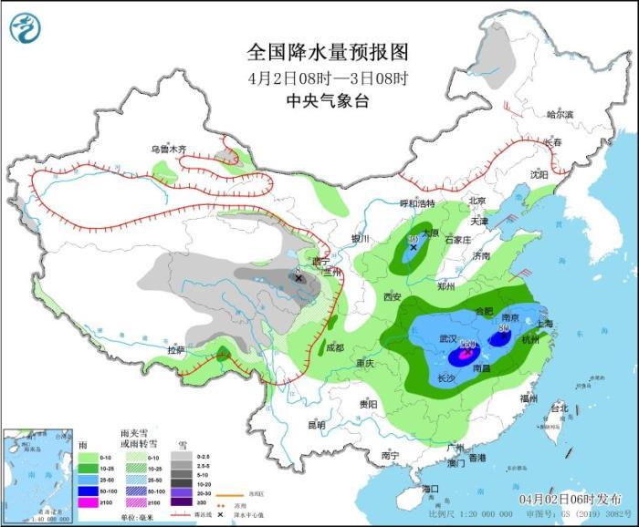4月2日08時至3日08時,內蒙古東北部、西藏東部、甘肅河西、青海中南部、川西高原北部等地部分地區(qū)有小雪或雨夾雪,其中,西藏東南部、青海東南部、甘肅西南部等地部分地區(qū)有中到大雪(5~8毫米)。陜西東部、山西西部、黃淮南部、江淮大部、江漢、江南北部、四川盆地東部、重慶東北部等地部分地區(qū)有中到大雨,其中,湖北東南部、湖南東北部、安徽東南部、江西東北部等地部分地區(qū)有暴雨,局地大暴雨(100~150毫米)。內蒙古東北部部分地區(qū)有4~5級風。