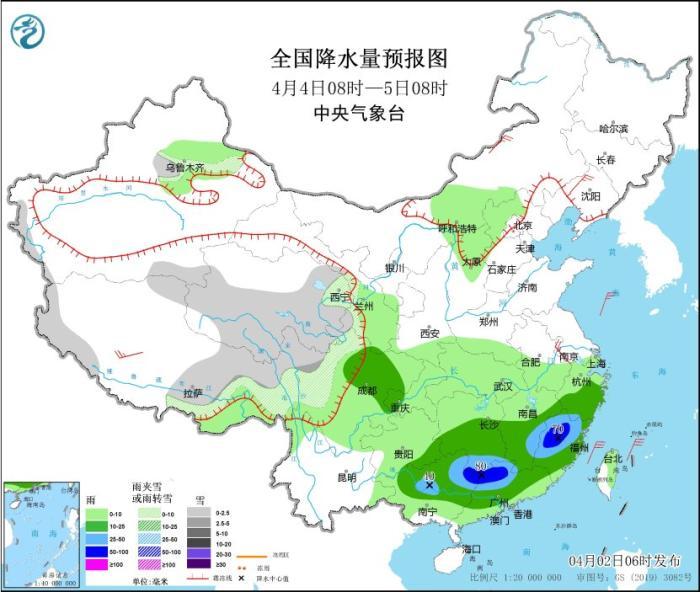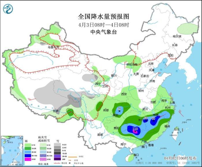 4月3日08時至4日08時,新疆北疆北部和伊犁河谷沿天山一帶、西藏北部、青海東北部和南部、甘肅河西、川西高原北部、黑龍江東部等地部分地區(qū)有小到中雪或雨夾雪。江南中南部、西南地區(qū)東北部、華南北部等地部分地區(qū)有中到大雨,其中,湖南西南部、江西中部、廣西東北部、廣東西北部等地部分地區(qū)有暴雨或大暴雨(100~110毫米)。內蒙古河套地區(qū)和中部、新疆沿天山地區(qū)、西藏南部等地部分地區(qū)有4~5級風。