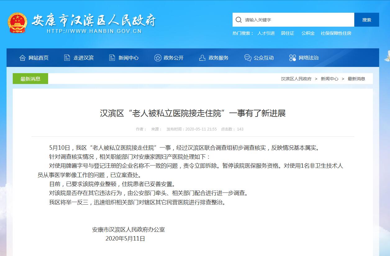 中新網(wǎng)5月12日電 據(jù)陜西安康市漢濱區(qū)人民政府網(wǎng)站消息,對于安康市漢濱區(qū)“老人被私立醫(yī)院接走住院”一事,經(jīng)漢濱區(qū)聯(lián)合調(diào)查組初步調(diào)查核實(shí),反映情況基本屬實(shí)。目前,已要求該院停業(yè)整頓,住院患者已妥善安置。