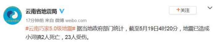 中新網(wǎng)5月19日電 據(jù)云南省地震局官方微博消息,據(jù)當(dāng)?shù)卣块T(mén)統(tǒng)計(jì),截至5月19日4時(shí)20分,地震已造成小河鎮(zhèn)2人死亡,23人受傷。