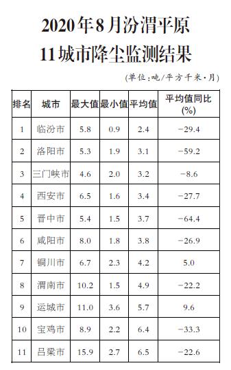 8月,汾渭平原11個城市降塵量均值范圍在2.4-6.5 噸/平方千米·月之間,平均為4.3噸/平方千米·月,同比下降30.6%。汾渭平原11個城市降塵量平均值均小于9.0噸/平方千米·月。渭南、運(yùn)城、呂梁等3個城市降塵量最大值大于9.0噸/平方千米·月;銅川、運(yùn)城等兩個城市降塵量平均值同比不降反升。