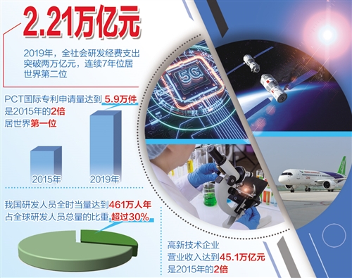 科技創(chuàng)新實(shí)力顯著增強(qiáng)。2019年,全社會(huì)研發(fā)經(jīng)費(fèi)支出達(dá)到2.21萬(wàn)億元,是2015年的1.56倍,連續(xù)7年位居世界第二位,占全球研發(fā)經(jīng)費(fèi)總量的比例超過(guò)16%。2019年,PCT國(guó)際專利申請(qǐng)量達(dá)到5.9萬(wàn)件,是2015年的2倍,躍居世界第一位。2019年,每萬(wàn)人有效發(fā)明專利擁有量達(dá)到13.3件,提前完成國(guó)家“十三五”規(guī)劃目標(biāo)。