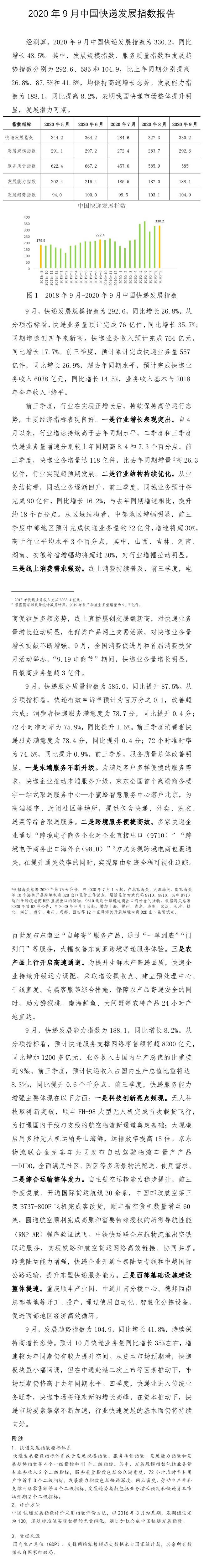 中新網(wǎng)10月10日電 據(jù)國家郵政局網(wǎng)站消息,國家郵政局10日公布2020年9月中國快遞發(fā)展指數(shù)報(bào)告。報(bào)告指出,經(jīng)測算,2020年9月中國快遞發(fā)展指數(shù)為330.2,同比增長48.5%。
