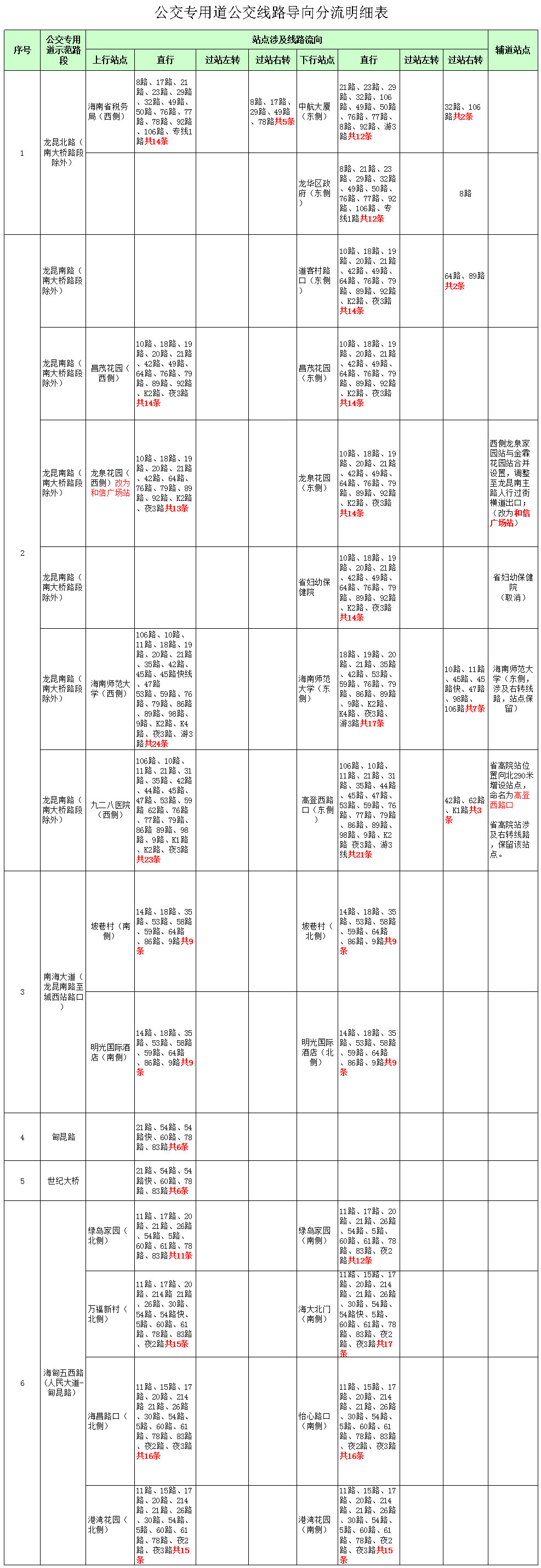 公交專(zhuān)用道啟用后,部分公交站點(diǎn)也將做出相應(yīng)調(diào)整,龍昆南路段道客村公交站北移約50米(保留原站點(diǎn)名稱(chēng));昌茂花園公交站(東、西側(cè))兩個(gè)站點(diǎn)調(diào)整至龍昆南路主路兩側(cè)人行過(guò)街橫道出口(保留原站點(diǎn)名稱(chēng));東側(cè)龍泉家園公交站北移60米并調(diào)整至龍昆南路主路(保留原站點(diǎn)名稱(chēng));龍泉家園公交站(西側(cè))與金霖花園公交站合并設(shè)置,調(diào)整至龍昆南主路人行過(guò)街橫道出口(更名為和信廣場(chǎng)站);省婦幼保健院公交站調(diào)整至龍昆南路主路人行過(guò)街橫道出口(保留原站點(diǎn)名稱(chēng));海南師范大學(xué)公交站北移80米并調(diào)整至龍昆南路主路(保留原站點(diǎn)名稱(chēng));省高院站公交站位置向北290米增設(shè)站點(diǎn),命名為高登西街路口公交站,同時(shí)調(diào)整至龍昆南路主路人行過(guò)街橫道出口。龍昆北路段省國(guó)稅局公交站南移約200米,更名為海南省稅務(wù)局站;景瑞大廈站遷移至國(guó)貿(mào)大道,保留原站名。