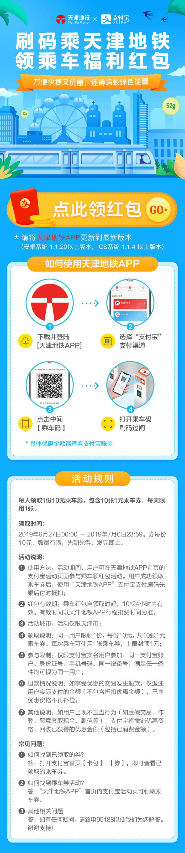 為回饋廣大市民對(duì)天津地鐵的支持,天津軌道交通運(yùn)營(yíng)集團(tuán)有限公司與支付寶(中國(guó))網(wǎng)絡(luò)技術(shù)有限公司聯(lián)合開(kāi)展出行優(yōu)惠活動(dòng),自2019年6月27日至2019年7月6日期間,乘客可在天津地鐵APP或支付寶APP領(lǐng)取支付寶紅包。