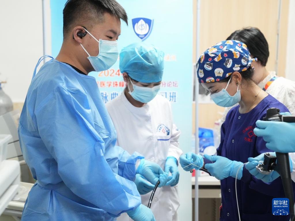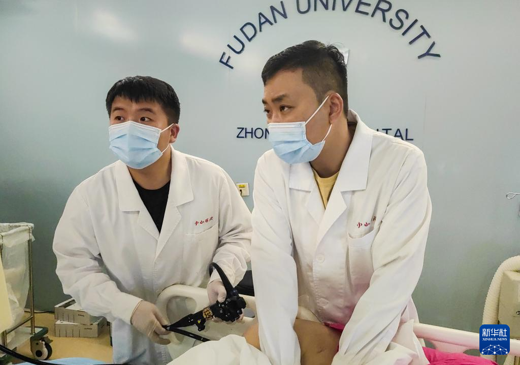在復(fù)旦大學(xué)附屬中山醫(yī)院,段穎騫(左)在老師胡健衛(wèi)的指導(dǎo)下進(jìn)行內(nèi)鏡手術(shù)(6月26日攝)。新華社記者 龔雯 攝