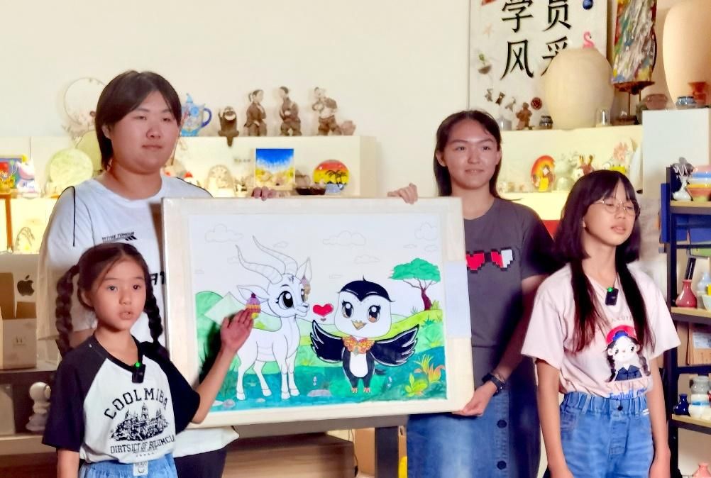 活動期間,北京的劉心語、吳梓菡、文藝、吳辰希與西藏的旦增雍措、旦增尼瑪、徐杰、索朗央珍等兩地青少年代表,通過“同繪一幅畫”的方式,將西藏的藏羚羊與北京的雨燕巧妙地融合在一個畫面之中。畫作中,一邊是象征北京自由與活力的“空中旅行家”雨燕在無邊的藍(lán)天中翱翔,另一邊則是代表西藏堅韌與生機(jī)的藏羚羊在遼闊的無人區(qū)自由奔跑。盡管兩者習(xí)性迥異、棲息地不同,它們共同展現(xiàn)了自由無束的特質(zhì),寓意著京藏兩地青少年盡管生活在不同的文化環(huán)境中,卻都能追求自由和快樂的成長。正如北京的孩子們說:“我們把來自拉薩的藏羚羊和來自北京的小雨燕聚集到一起,畫在了一個畫面中??矗翰亓缪虼髦刈宥?,小雨燕身著云領(lǐng)服飾,她們是盛裝出席啊。就像我們,北京和西藏的同學(xué)們,手拉著手,心連著心,書信往來,學(xué)習(xí)探究,相互幫助,一起成長。”西藏的孩子說:“我們就像畫中的藏羚羊和北京雨燕一樣,心手相牽,互相鼓舞,用積極的態(tài)度學(xué)習(xí)、生活,成為祖國的好少年!”。