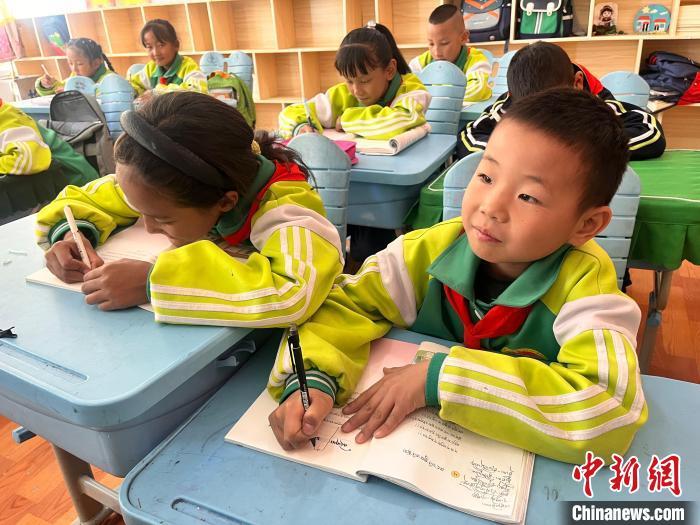與此同時(shí),四年級(jí)2班的漢族學(xué)生劉念恩正在上藏語(yǔ)文課,他抄寫有些慢,同桌的女生立刻用筆幫他找到對(duì)照位置?!拔覀儼嘀挥形乙粋€(gè)漢族,我也要上藏語(yǔ)文課,同學(xué)們和我關(guān)系非常好,我們經(jīng)常一起踢足球。”劉念恩說(shuō)。