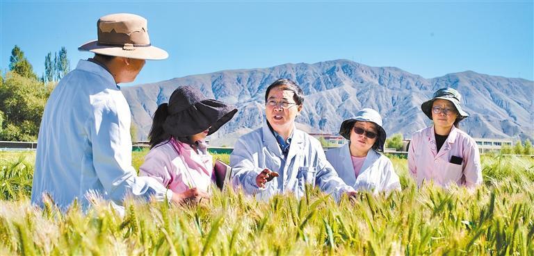 8月16日,山東援藏農(nóng)業(yè)專家、日喀則市農(nóng)牧業(yè)科學(xué)研究推廣中心副主任張斌(中)在青稞試驗(yàn)田里指導(dǎo)種植。經(jīng)濟(jì)日報記者 袁勇 攝