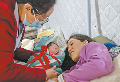 1月10日,日喀則市定日縣人民醫(yī)院婦產科醫(yī)生在照看一對母子。這名新生兒在9日剛剛出生。本報記者 張武軍攝