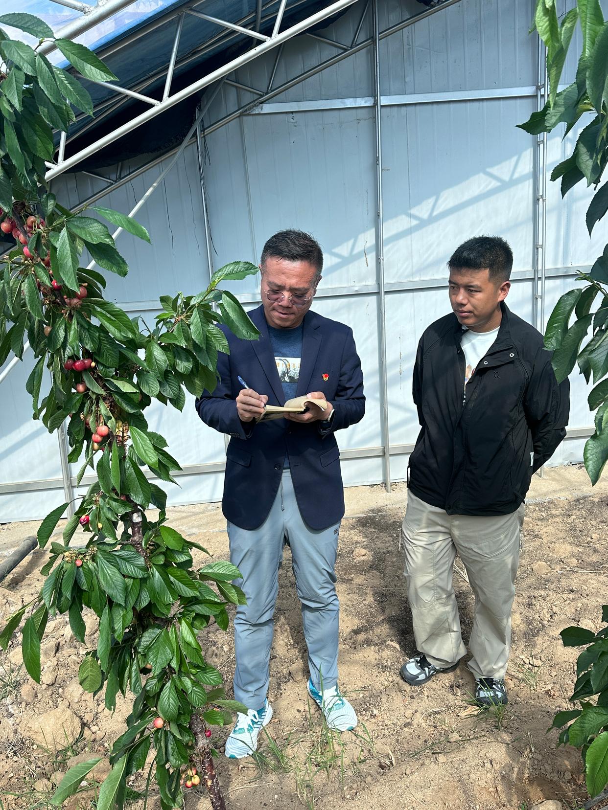 牛堯琪(左)在新建2號(hào)櫻桃棚記錄櫻桃結(jié)果轉(zhuǎn)色情況