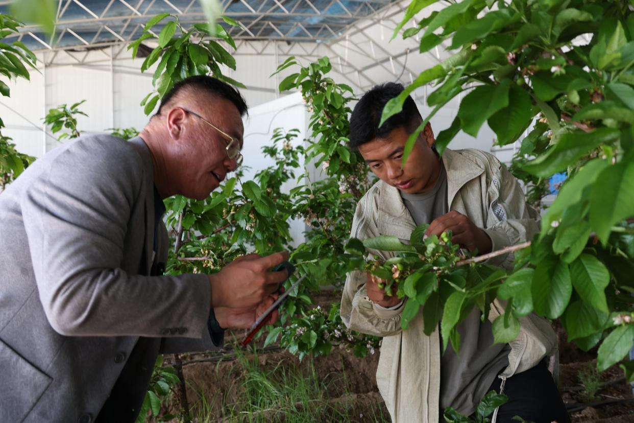 圖為牛堯琪(左)在櫻桃園觀察櫻桃長(zhǎng)勢(shì)