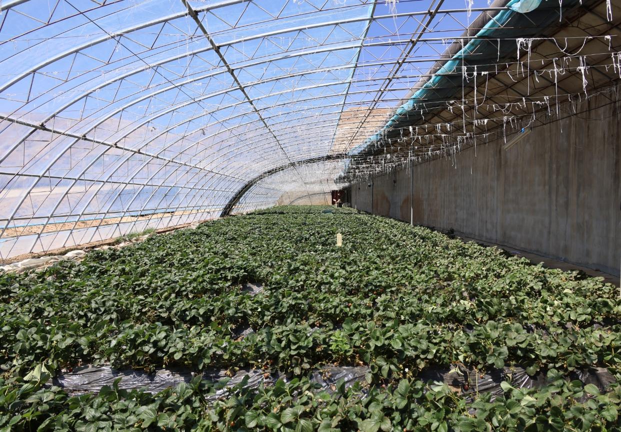 圖為牛堯琪在草莓大棚觀察草莓長(zhǎng)勢(shì)