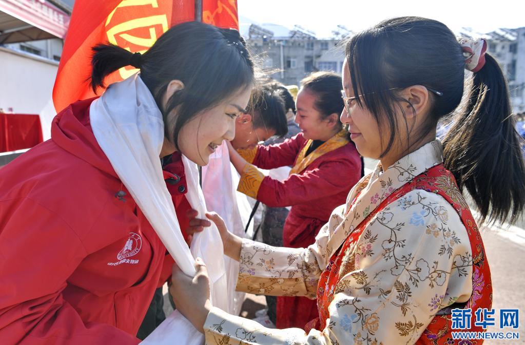 山南市東輝中學(xué)學(xué)生代表向湖北大學(xué)碩士研究生支教團(tuán)成員獻(xiàn)哈達(dá)(3月29日攝)。新華社記者 張汝鋒 攝
