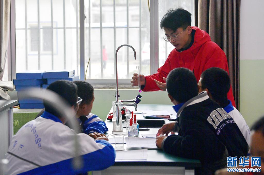 在山南市東輝中學(xué)實(shí)驗(yàn)室,來(lái)自湖北大學(xué)化學(xué)化工學(xué)院的碩士研究生劉思江指導(dǎo)學(xué)生做化學(xué)實(shí)驗(yàn)(3月29日攝)。新華社記者 張汝鋒 攝
