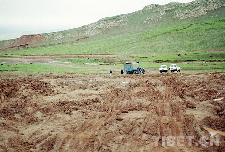 過去,由于交通不便,從班戈縣通往雙湖辦事處(現(xiàn)雙湖縣)的草原路,汽車常遭遇陷車等困難。這是過去汽車通過的一段泥濘路(唐召明2001年攝)