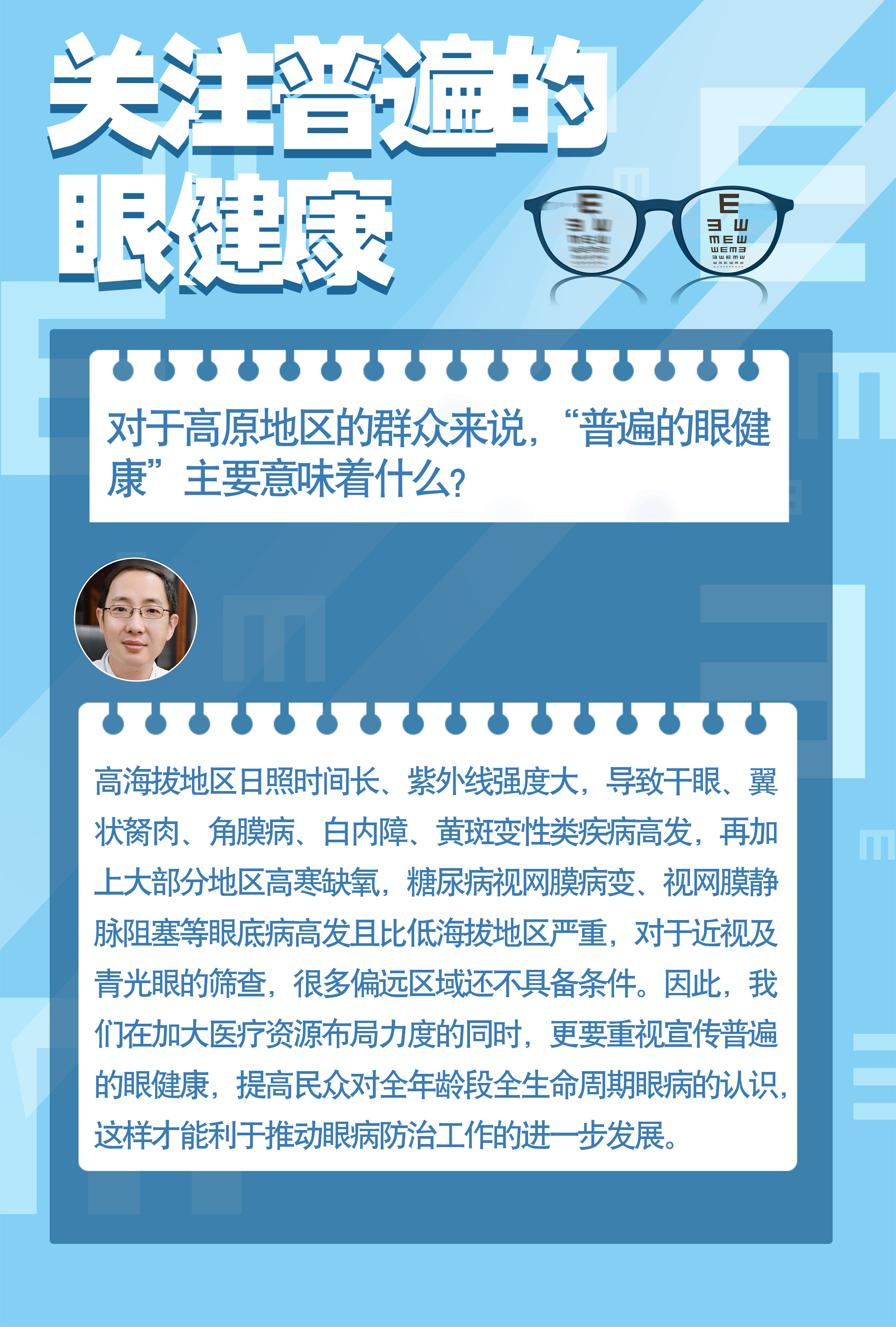 眼睛是人類感官中最重要的器官之一,也是人體最容易罹患疾病的器官之一。著重關(guān)注兒童青少年、老年人兩個重點(diǎn)人群,防治近視、白內(nèi)障、眼底病、青光眼、角膜盲等重點(diǎn)眼病,提高全社會對全年齡段全生命周期普遍眼健康的認(rèn)識,尤為重要。
