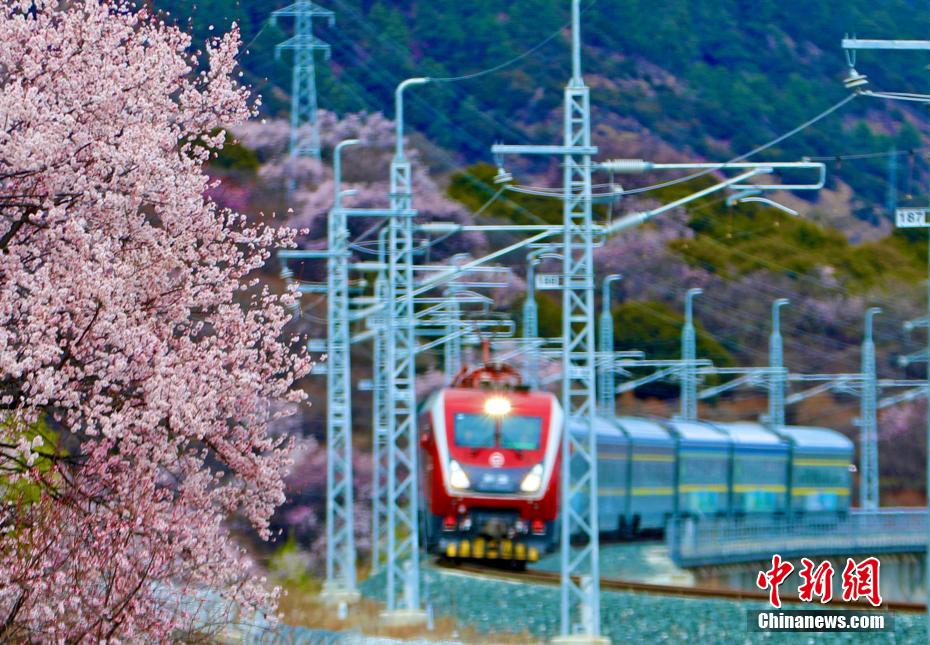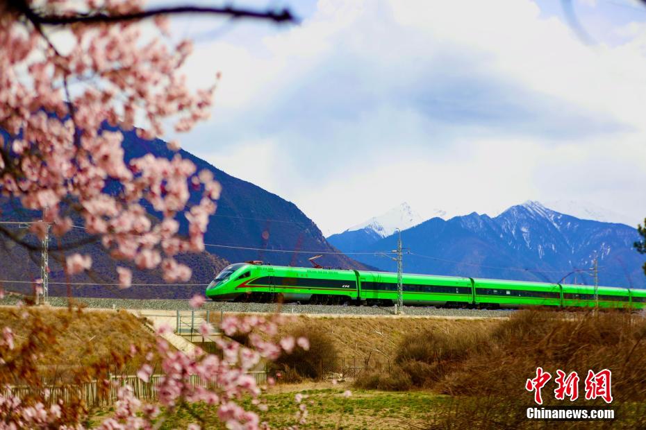 被譽(yù)為新“天路”的拉林鐵路,是中國(guó)首條高原電氣化鐵路,于2021年6月25日開通運(yùn)營(yíng),結(jié)束了西藏東南地區(qū)不通鐵路的歷史。圖為拉林鐵路沿線桃花盛開,與飛馳而過(guò)的動(dòng)車構(gòu)成別樣風(fēng)景圖。
