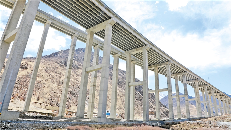 從村里看,一排整齊的高架橋墩像聳立的巨柱一樣,在山里蜿蜒。橋墩托舉著平坦寬闊的公路,從空中穿過(guò),在海拔4200多米的半山腰一頭扎進(jìn)山體里,鑿出兩個(gè)山洞,然后貫穿圭嘎拉山,一直延伸到山南去。