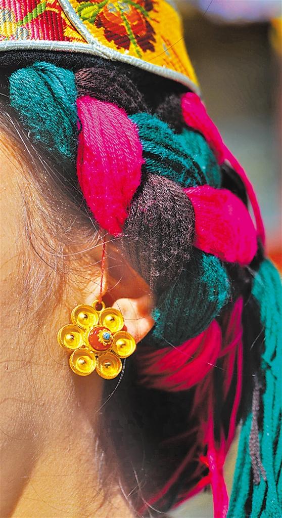女士們的服飾則更加絢麗多彩。她們大多穿著黑色氆氌藏袍,系著彩虹條紋的圍裙“邦典”,既顯得端莊得體,又不失女性柔美。她們佩戴的耳環(huán)、項鏈、手鐲、戒指等飾物雖然簡單,但卻淡雅樸素,與高原的自然風(fēng)光相得益彰。特別值得一提的是,墨竹工卡縣的女性喜愛佩戴花朵形耳飾,與她們所戴的帽子“朗霞”形成了完美的搭配。