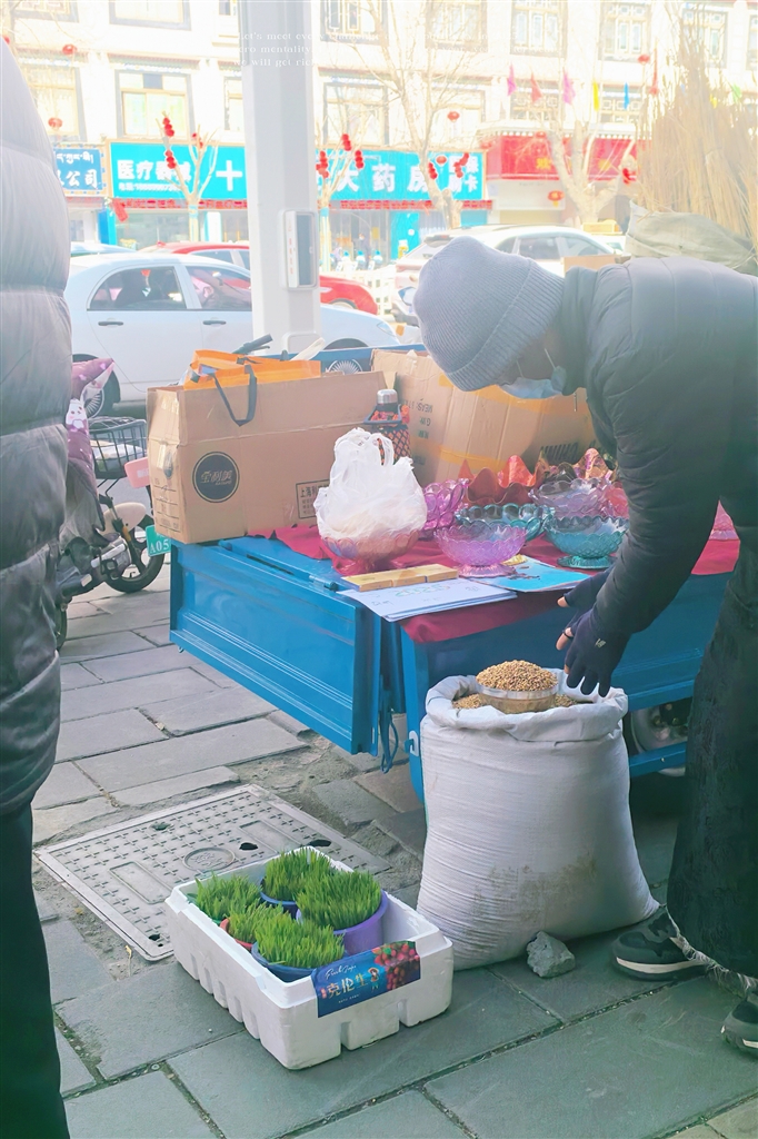 前來采購的格桑卓嘎阿姨,手里提著大包小包,臉上滿是笑意。她買了青稞酒、酥油、風(fēng)干肉還有青稞苗。新年時,用青稞酒祈福,酥油茶招待客人,風(fēng)干牛肉和新鮮軟糯的拉拉、用酥油雕出精美圖案的“推”一起擺盤,供客人隨時食用?!敖衲辍磐弧汀矢隆峭惶欤蛩闳覈黄鸪?。家里布置都按習(xí)俗,擺好切瑪、德卡、青稞苗,再給門窗換上新的‘香布’。孩子們買了不少藏文對聯(lián),說是要貼門上,祈福來年順?biāo)?。帶孩子來傳統(tǒng)市集,就是要讓他們記住咱們藏歷新年的習(xí)俗。這些年,市集多了些漂亮的藏式手工藝品,不過最有年味兒的,還得是這糌粑和青稞粒的香?!?/p>