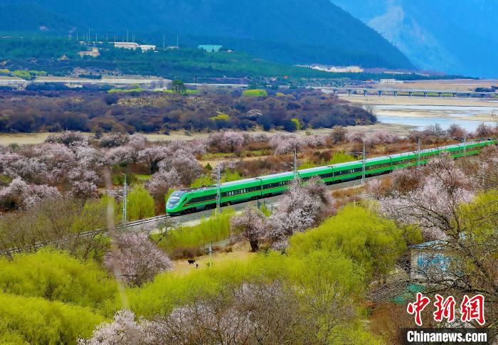 圖為飛馳在拉林鐵路桃花密林間的復(fù)興號(hào)列車(chē)。馬生明 攝