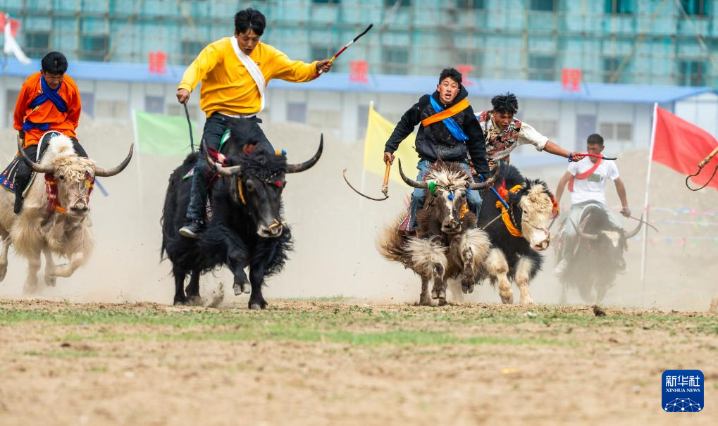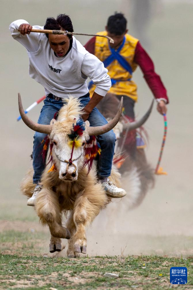 5月29日,當(dāng)?shù)剞r(nóng)牧民群眾在賽牦牛比賽中。新華社記者 丁增尼達(dá) 攝