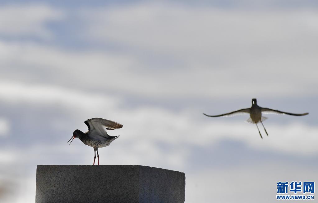 初夏,紅腳鷸在位于西藏拉薩的拉魯濕地國(guó)家級(jí)自然保護(hù)區(qū)內(nèi)起舞覓食。