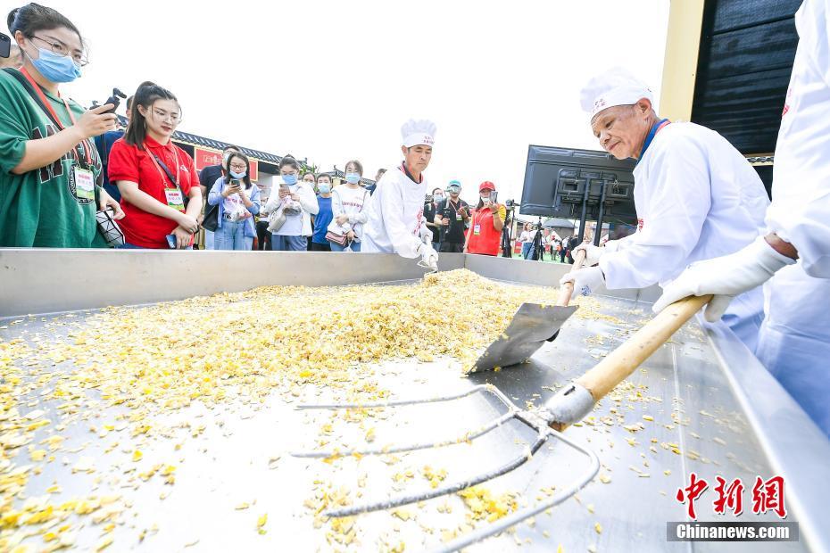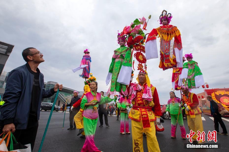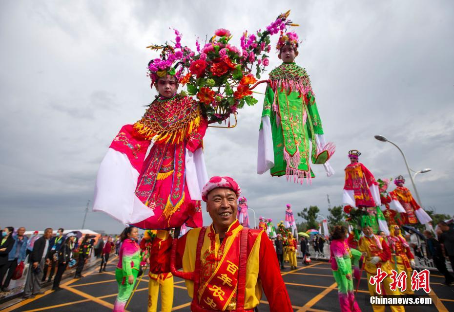 9月23日,山西晉中,當(dāng)?shù)孛癖姳硌萆缁饝c祝豐收節(jié)。當(dāng)日,2021年中國農(nóng)民豐收節(jié)山西慶?;顒?dòng)暨第七屆中國(山西)特色農(nóng)產(chǎn)品交易博覽會(huì)在晉中國家農(nóng)高區(qū)(山西省農(nóng)產(chǎn)品國際交易中心)開幕。 中新社記者 張?jiān)?攝