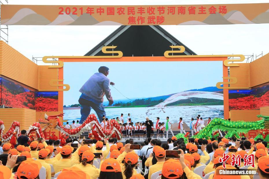 9月23日,2021中國農(nóng)民豐收節(jié)河南省主會(huì)場在焦作市武陟縣嘉應(yīng)觀啟幕?;顒?dòng)現(xiàn)場,隨處可見“豐收”符號(hào),各類農(nóng)副產(chǎn)品琳瑯滿目,船上漁民捧著魚喜笑顏開。圖為2021中國農(nóng)民豐收節(jié)河南省主會(huì)場。闞力 攝