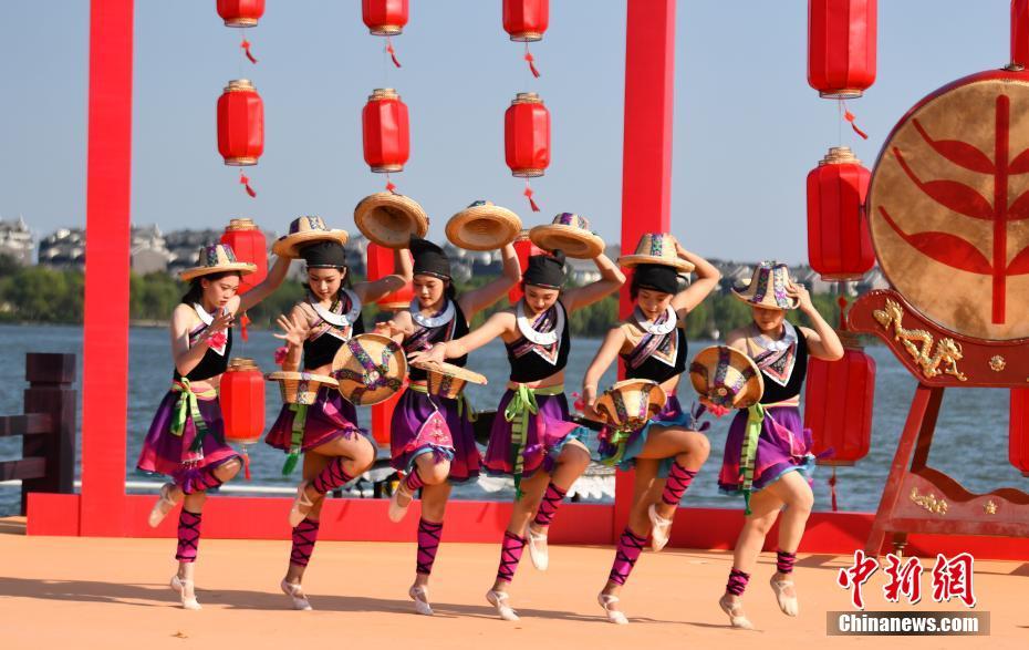 9月23日下午,2021年中國農(nóng)民豐收節(jié)浙江嘉興主場其中一項(xiàng)子活動(dòng),“亮絕活·樂豐收”長江水文化習(xí)俗展演活動(dòng)在浙江嘉興湘家蕩月亮灣沙灘舉行。歌舞表演、非物質(zhì)文化遺產(chǎn)技藝表演、水上特技表演等特色融合節(jié)目集中亮相,精彩的演出吸引了觀看者掌聲不斷。圖為演藝人員在表演《快樂的草帽》。張茵 攝