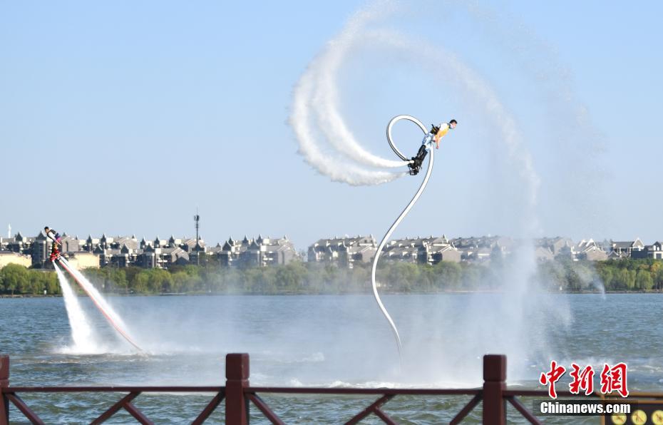 9月23日下午,2021年中國農(nóng)民豐收節(jié)浙江嘉興主場其中一項(xiàng)子活動(dòng),“亮絕活·樂豐收”長江水文化習(xí)俗展演活動(dòng)在浙江嘉興湘家蕩月亮灣沙灘舉行。歌舞表演、非物質(zhì)文化遺產(chǎn)技藝表演、水上特技表演等特色融合節(jié)目集中亮相,精彩的演出吸引了觀看者掌聲不斷。圖為兩名演藝者在水上表演“水上特技”。張茵 攝