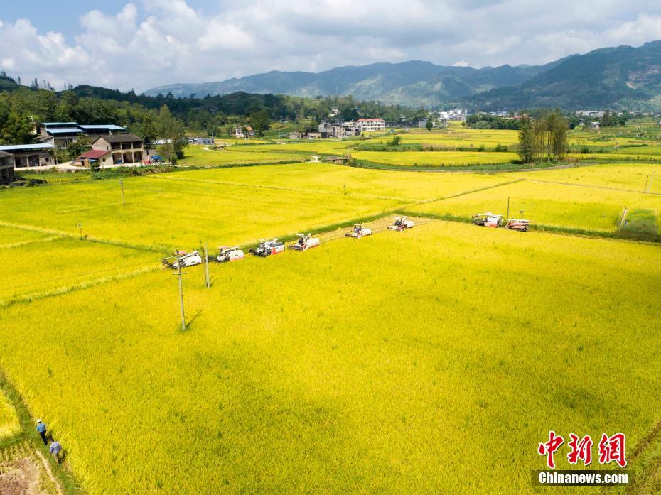 9月23日,2021年中國農(nóng)民豐收節(jié)·第一屆“天生云陽”金秋節(jié)在重慶云陽縣鳳鳴鎮(zhèn)拉開序幕。時(shí)下正是豐收的季節(jié),三峽庫區(qū)腹地重慶云陽縣的農(nóng)民門正忙著搶收搶曬,確保水稻玉米等農(nóng)作物顆粒歸倉。圖為在重慶云陽縣路陽鎮(zhèn),一字排開的8臺(tái)大型收割機(jī)正在稻田中收割成熟的水稻。劉興敏 攝